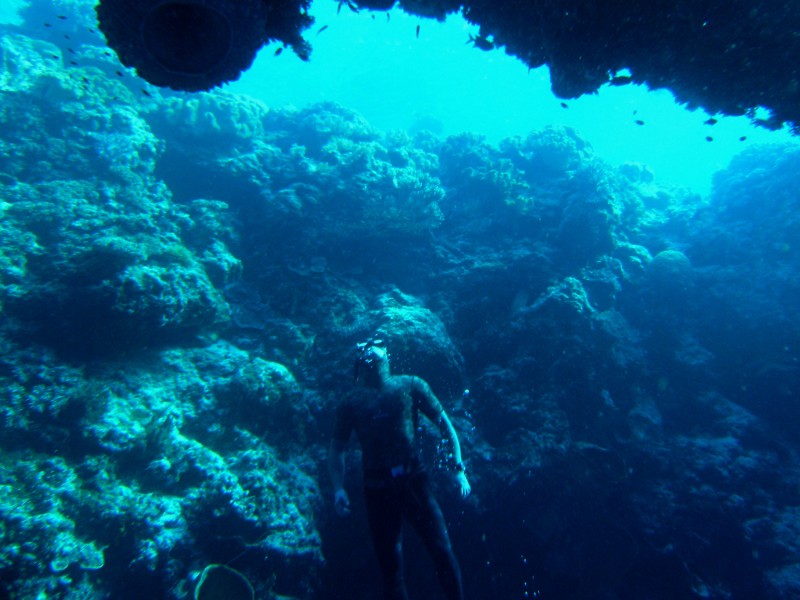 Kad se vraćam u kuću stari je več budan. Doručkujemo banane, nekakvo pecivo i čaj. Nakon toga odlazimo još malo razgledavati okolicu pa se vraćamo na ručak. Oko jedan sat uzimamo svu opremu pa krećemo na ronjenje. Točno ispred sela se proteže pješčana pličina, pa odlučujemo prošetati nekih 10 minuta uz more do mjesta gdje je rub za loviti bliži obali. Prvih nekoliko desetaka metara i tu je pijesak, ali se brzo počinju pojavljivati prvi koralji. Ubrzo dolazimo i do ruba, koji je lijepo razveden i ima čak i "mostova". Voda je bistra i teren je stvarno atraktivan za ronjenje.