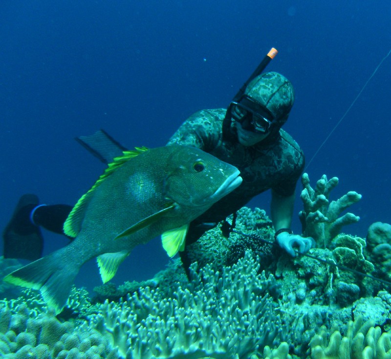 Ako nema adekvatnog zaklona ni u zidu, onda nam ne preostaje drugo nego lov poniranjem. Uranjamo na mjestu gdje primjećujemo da kreče vertikalni procjep prema dnu koji se onda u dubini širi. Tu se redovito zadržava riba ( midnight snaperi, scribbled snaperi, red basovi, veliki many spoted sweetlipsi. . ), a često nailaze i manji primjerci giant trevallya te veći primjerci bluefin trevallya. Dubine za takav lov su nešto veće. Iznad 20 metara. Na rubu uočavam par koraljnih tvorevina sličnih krofnama. Idealno mjesto za ćeke. Oko takvih većih nakupina koralja i kamenja se uvijek zadržava i riba. Postavljam se na prvu ćeku i odmah nailazi lijepi scribbled snaper. Prilazi mi skroz blizu jer sam dobro postavljen na dnu pa me ne primječuje do zadnjeg trena. Kad je već pre kasno. Pogodjeni scribbled snaper se uvijek ponaša isto. Vrti se u krug i pokušava se osloboditi strijele, a cim ne uspijeva zabija se pod prvi kamen ili uvlači u procjep.