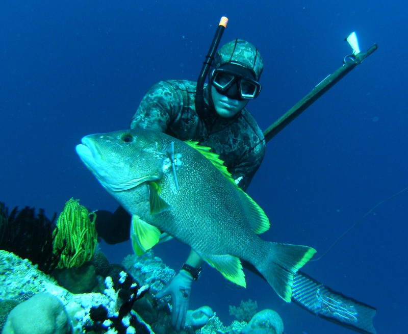 Nakon toga nalijeće jedan cale-cale trevally i skidam ga "u letu". Nisam vidio ni jednog blue fin trevallya, a ni red basa. Tada primjećujem jednu barakudu kako stoji u svojoj tipičnoj pozi. Lebdi nepomično iznad ruba na neka dva metra od dna okomito na smjer pružanja obale s glavom prema otvorenom moru. Zaranjam na nekih 15 metara od nje i jako polako se povlačim po dnu dok joj nisam dovoljno blizu za pogodak. Pogađam je, a ona kao svaka pogođena barakuda strelovito bježi prema dubini. Ali to joj neće pomoči jer je dobro pogođena. Hvatam i jednog sweetlipsa, kojih tu baš nema puno. Vjerojatno zbog pomankanja adekvatnih skloništa. Rub je na većem dijelu prilično ravan, bez izraženijih izbočina i stijena. Na takvim mjestima se večina ribe zadržava na malobrojnim nakupinama koralja i gljvolikim koraljnim tvorevinama. Na tim mjestima je i lov lakši, a i zanimljiviji, jer se ribolovac može uspješno prikriti dok je na čeki. Na jednoj takvoj poziciji primjećujem par maori snapera. Nisu baš pretjerano oduševljeni mojom prisutnošću i ne dolaze na domet, pa mi je jedina mogućnost da kojeg skinem ta da u trenutku kad vidim da riba neće prići bliže, napustim svoj zaklon i jako pažljivo krenem prema ribi kako bi smanjio distancu i doveo se u položaj iz kojeg je izvjesno da mogu pogoditi ribu. To je upalilo i drugi lijepi maori snaper je tu. Cijela ta operacija, najprije čekanje, pa onda napredovanje traje nešto duže, ali na tom mjestu su dubine samo između 10 i 12 metara, pa uron može biti bez problema duži. . .