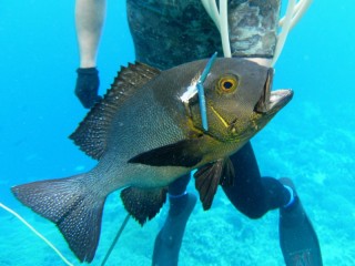 Struja je jako slaba ali me ipak polako nosi prema zapadu, pa tako dolazim do prvog malo izraženijeg rta oko kojeg se zadržava veliko jato midnight snapera. Među njima nema maori snapera ni druge ribe. Postavljam se na prvu čeku da vidim kako se jato ponaša, jer se midnight snaperi na različitim pozicijama koji put jako različito ponašaju. Jato ostaje mirno, na istoj visini i ne izgleda uplašeno. Samo nepomično čekam dok mi prvi ne dođe na domet. Pucam čim se počne okretati i pogađam ga u sredinu tijela odmah iza škrga. Povlačim ga prema sebi prije nego se uopće pokuša zavući u kakvu rupu, kako bi što manje uznemirio jato. Odmah nakon toga opet zaranjam i na isti način hvatam još jednog.