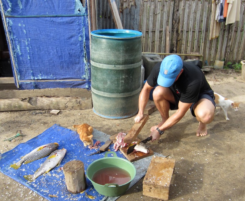 Vraćamo se u selo i bacam ulov cijelog dana na gradele. Lokalci su donijeli još gradela pa ide dosta brzo. Okupilo se pola sela!
