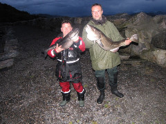 Mijenjamo poštu i idemo do drugih kaveza još nekih pola sata vožnje, gdje srećemo drugu ekipu sa Jardom koji su plutali i liječili se od prošle noći. Odlazimo malo dalje od njih i zabacujemo udice. Sistem lova je sličan našem jiggingu, samo puno ležerniji. Nema cimanja kao da imaš srčani udar, nego sve pomalo. Najednom smo ih našli i počinje zabava. Riba za ribom. Dubina 120m, ali varalica često ne padne do dna, nego ju "crne treske" uzimaju u po mora. Kako nas vjetar nosi dalje, ribe manje rade, i dubina je sve veća. Imam griz jedne prave i borba traje 5-10 minuta. Izvlačim moju prvu Tresku (običnu), odnosno po naški bakalara. Ne samo da mi je prvi bakalar, nego je, kako se kasnije pokazalo, i moja najveća riba. Bakalar je duljio ravno 98 cm! Naraste on i veći, ali danas je to najveća riba dana! Inače tamo nitko ne nosi vagu, nego svim ribama mjere duljinu, tako da nemam pojma koliko je težak. Prosudite sami! Nakon toga se premještamo i Petr vadi jednu lijepu "crnu".