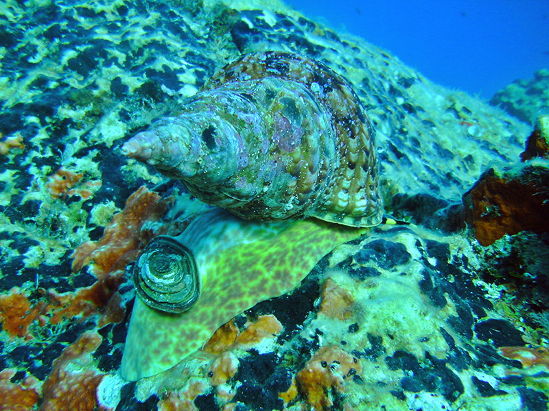 Ova vrsta tritona koju sam pronašao zove se Tritonova truba, znanstevenog naziva Charonia tritonis, koji naraste do 45 cm u dužinu i preko 1 kg u težinu. To je puž vretenastog oblika i glatke površine sa nekoliko izbočenih nabora. Izmrljan je jednim karakterističnim uzorkom od tamno i svijetlo smeđih, bež i žućkasto bijelih boja. Najčešće se boje vide bolje na strani na kojoj često bude zakopan dok je druga strana nastanjena sitnim crvima cjevašima i ostalim vapnenačkim bićima koja se lijepe za podloge. Radi se o vrlo grabežljivom stvorenju i za puža prilično brzom strvinaru koji će u slučaju da nanjuši nešto u svojoj blizini brzo pohitati do plijena. Najčešće se hrani raznim vrstama zvjezdača i ostalih puževa koji su ustvari i najdostupniji njegovoj brzini. Poput većine grabežljivih puževa ima radulu kojom probija oklope puževa i ostalih tvrđih bića te sa njom uštrcava otrov koji paralizira plijen, ali i probavlja meso. Manje žrtve progutat će cijele. Tritoni imaju razdvojene spolove što je isto rijedak slučaj u svijetu puževa. Ženke polože duga i ljepljiva jaja na dno i nakon oplodnje žive kao plankton do 3 mjeseca.