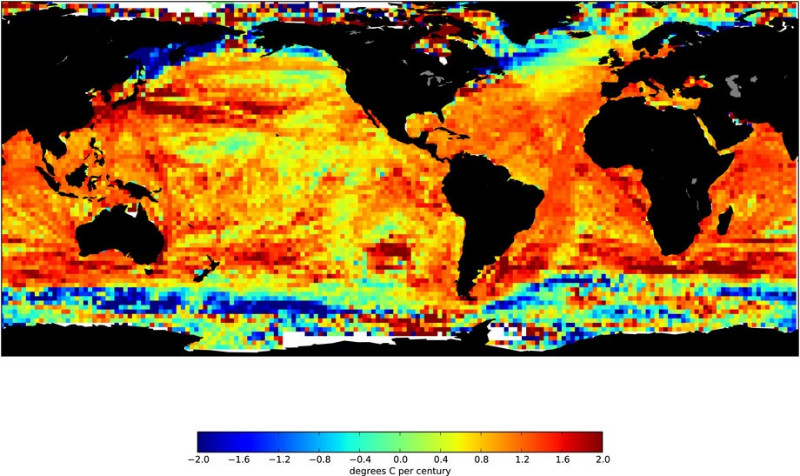 Kada govorimo o klimatskim promjenama, uglavnom mislimo na atmosferu. Međutim, precizna mjerenja pokazuju da se mnogi dijelovi mora i oceana također ubrzano zagrijavaju. Detaljna karta koju je ovih dana objavila kalifornijska organizacija Marinexplore otkriva da je površinska temperatura u Atlantskom, Tihom i Indijskom oceanu u posljednjih stotinjak godina porasla za jedan stupanj, a u nekim područjima, među kojima i na sjeveru Jadranskog mora, za čak dva stupnja Celzijusova. Zagrijavanje mora nije jednolično. Neki dijelovi Južnog oceana oko Antarktike čak su se ohladili. U Arktičkom oceanu promjene temperature još su raznolikije - kreću se od dva stupnja zahlađenja do dva stupnja zatopljenja.