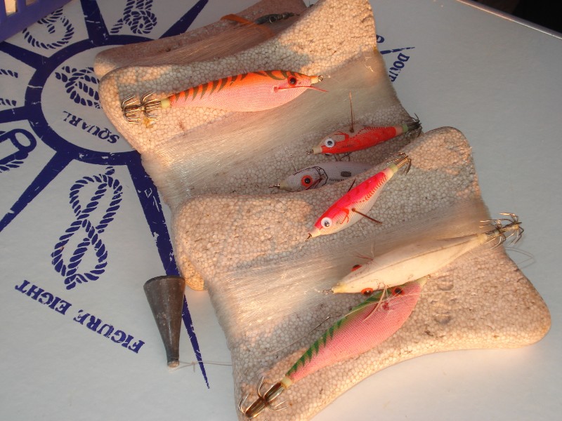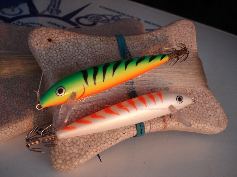 | Varalice Postoji 4 osnovna tipa varalica za lignjolov. Zanimljiva je njihova nomenklatura, a primijetio sam da tu kod mnogih ribolovaca dolazi do raznih zabuna i miješanja imena. Najstarija i možda najpoznatija varalica je peškafondo. To je olovna imitacija ribice, presvučen je tkaninom koja može biti različitih boja, a na kraju peškafonda se nalazi vijenac od inox iglica kojim kačimo lignju za krakove. Služi uglavnom za nešto dublji lov na mjestu, ili niz vjetar. Za nešto plići lov u pokretu izmišljena je skosavica - platićna imitacija ribice, obično presvučena tkaninom raznoraznih boja i uzoraka, s krunicom (vijenac) od iglica koju ustvari imaju sve vrste varalica za lignjolov. Za skosavicu je karakterističan olovni stabilizator s donje strane ispod očiju, koji ju drži u pravilnom položaju i daje joj laganu negativnu plovnost. Treći tip varalice je lebdeća skosavica, takozvana mrkva, koja se od skosavice najviše razlikuje po tome što nema olovni stabilizator, a oblikom je samo neznatno drugačija. Koristi se u lovu na mjestu, u kombinaciji s peškafondom, a rijetko u lovu u pokretu na konstrukciji namijenjenoj skosavici, jer tako daje lošije rezultate od skosavice. Kronološki možda najmlađa je varalica za panulivanje, koju kod nas često zovu rapala, prema najpoznatijoj firmi koja izrađuje ovakav tip varalica. To je ustvari klasični vobler koji umjesto rampina ima na kraju vijenac s iglicama, a najbolje radi pri brzinama od 1,5 - 3 čvora. |