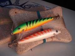 Crvena ili zelena? Ova je tema oduvijek bila predmet beskrajnih rasprava. Koja boja varalice najbolje radi? Neki se kunu u crvenu, drugi čupaju samo s plavom, treći stave mrkve svih boja na sistem... Ne bih volio previše palamuditi oko toga pa ću samo reći kojim bojama ja lovim. Skosavica mi je gotovo uvijek narančaste boje, rijetko crvena ili roza. S druge strane, mnogi mi kažu da im je zelena najbolja. Pa ti sad budi pametan! Peškafondo mi je najbolji bijeli, s crvenim okom ili nekim drugim detaljima crvene boje. Odličan je i onaj presvučen kožom od pauka. Mrkve koristim svih boja. Imam više sistema, pa kombiniram, ne radi uvijek ista boja. Uglavnom su najbolje bijele, narančaste i zelene. Opet, bilo je večeri kad su samo plave lovile. Za rapalu svi kažu da je najbolja narančasta sa zlatnim trbuhom, a poslije nje zelena s tigrastim leđima. I to da bolje love veće nego manje. Kod mene je obrnuto, bolje sam rezultate imao sa zelenima i to sa manjima! Dobra je i bijela s narančastim tigrastim leđima. |