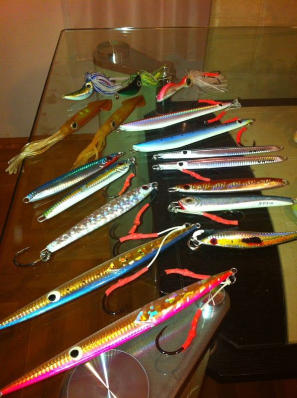 Role su također kvalitetnije, sa jačim kočnicama, više ležajeva, većim prijenosom, tako da danas postoji više proizvođača koji su se specijalizirali za proizvodnju takve opreme kao npr. Shimano, Okuma, Daiwa... Upredenice koje se koriste su najčešće snage od 60 ili 80 libri, takve i preporučam, te su sasvim dovoljne da odrade svoj posao i sa većim ribama koje plivaju u našem moru. Zjogulini koji se koriste su veće nosivosti od 150 do 300 libri. Jigovi su obično od 120 do 250 grama, a među lovnije boje su se pokazale: pink, pink-blue, red. Međutim, ovisno o vlastitim preferencijama, svatko od ribolovaca izabire izdržljivost opreme koju će koristiti i koja mu pruža najveći užitak u borbi sa ulovljenom ribom.
