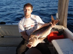 Imao sam samo jedno pravo testiranje, mada to samo po sebi još ne znači ništa. Lovio sam u jakom zmorašnjem korentu, koji me je s puntala izbacivao u dubinu. Umjesto zamišljenih 50-55 metara dubine, stalno me korent u kombinaciji s vjetrom bacao na 60-65 metara. Na kraju sam se namjerno pustio još dublje, u poluzavjetrinu na 67 metara dubine, gdje je zaravnala ljoga, sada već daleko od škrapa i zaklona kakve voli zubatac. To je panulivanje iznad zrnatog pijeska, gotovo šljunka, namjerno se puštam dok mi intuicija govori da se prasac tu negdje sakrio. Mene i lignju uz dno dijeli čak oko 150 metara tunje, čujem lagano da je nešto zatreslo i pustilo, ili ranj ili prefrigani zubatac. Vidim da se nema namjeru hraniti i pretpostavljam da će se samo još jednom poigrati s lignjom. Odlučujem biti brz, pojavljuje se još jednom na lignji s namjerom da ju kratko zatrese, čim ju je stisao vilicom kontrirao sam iz sve snage i na moju sreču zakačio ga! Vidim odmah da je pravi macan, strah me prvih nekoliko sekundi da ne ispadne. Procjenjujem ga dok se borimo na nekih 6,5-7 kila, iznenađujem me kako cijelo vrijeme energično pliva u stranu, nikako da se izmori do kraja. Na površinu dolazi nakon nekih 60-80 sekundi od griza, teško mi je procijeniti, no iznenađuje me kako mu uopće nije izašao mjehur unatoč tolikoj razlici u dubini i pritisku (razlika 1:8 bara). Na kraju ispada veći nego što sam mislio, vaga pokazuje 8,05 kg, riba u naponu snage. Vadim mu udicu iz usta, pregledavam nitinolski terminal kojeg je grizao, nigdje oštećenja osim izlizane boje. Izgleda super, no teško je na jednoj ribi reći nešto pametno. Vrijeme će pokazati svoje, a ja s nestrpljenjem čekam nova testiranja s velikim zubatim beštijama.