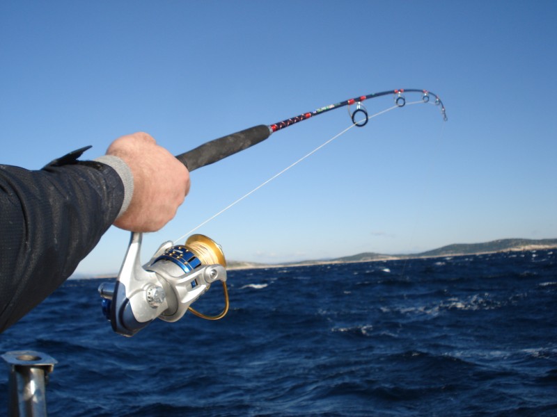 To ovisi o osobnim preferencijama ribolovca. Tu postoje neke objektivne okolnosti, neovisno o tome što nam se više sviđa. Tako pri lovu štapom kočnica multiplikatora/role može puno sigurnije i savršenije popuštati ribi da ne dođe do pucanja najlona. S rukom je to teže procijeniti, dok kočnica to radi čistom mehanikom, tu je fizika nepogrešiva. I štap svojim savijanjem preciznije može amortizirati udarce koje ulovljeni gof izvodi velikom i snažnom glavom. Kad se lovi štapom i rolom, može se za osnovu upotrebljavati i tanka a jaka upredenica, s kojom se zbog njenog smanjenog promjera i manjeg otpora mora postižu veće dubine uz manje otežanje. Međutim, pri lovu rukom lakše se prepozna vrsta griza, na koji način riba grize, lakše se pravovremeno malo popusti prije kontre, kad riba ponese ješku i još ne sluti što joj se sprema. Kod lova rukom, kad olova zastružu po dnu, iskusni panulaš čak može prepoznati vrstu dna po kojoj je zastrugao, da li je to pijesak, posidonia, kamen, rub itd. Dalje, rukom se može dati snažnija kontra, ruka može puno brže izvlačiti najlon itd. Sve ima svoje prednosti i mane. Kod lova sa štapom dva su načina otežanja. Kompliciraniji je pomoću downriggera. To je uređaj s kojim se na tankoj sajli ili jačoj upredenici u more spušta olovna kugla težine 1-5 kg. Kugla ima na sebi štipalicu kojom se kači najlon osnove sa štapa, na mjestu koje je udaljeno bar 20 metara od ješke. Tako pomoću kugle spuštamo ješku na željenu dubinu, a u trenutku kad udari gof ili zubatac, najlon sa štapa se oslobađa kugle downriggera i ribolovac sa štapom ima neposredni DSC06818kontakt s ribom. Drugi način je da direktno na najlon osnove na štapu montiramo olovno otežanje. Obično se koriste olova oblika sličnog torpedu sa zakačkama za najlon. Često su u upotrebi i različita olova čuvari koji se montiraju na najlon gumicom ili koncem tako da ih se lako i brzo skine kad se u tijeku borbe s ribom najlon namota do njih, da bi se potom najlon nastavio nesmetano namatati sve do predveza. Kao osnova na štapu, najboljom se pokazala kvalitetna upredenica koja ima istu nosivost kao i dosta deblji najlon. Tako možemo koristiti upredenice puno tanje od najlona koje stvaraju mali otpor u moru pa se tako mogu koristiti i lakša olova s kojima imamo bolji osjećaj prilikom panulivanja. Meni je daleko veći gušt loviti na ruku.