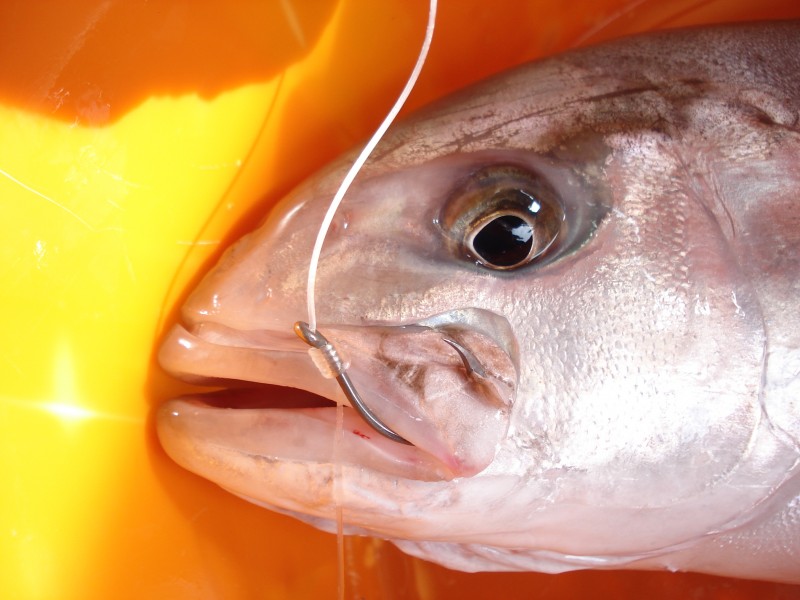 DSC03216Mase u koje se okupljaju znaju biti ogromne, po više stotina, ako ne i više tisuća velikih odraslih jedinki. To je bilo posebno izraženo po vanjskim Žirjanskim brakovima, gdje je zadnjih 3-4 godine sva sila ribolovaca tamanila gofove isključivo vertical jigging tehnikom. Uključili su se i profesionalci, neki su dizali i do 30 riba dnevno. Riba je bila blesava, grizla je jigove u padu. Opet, ni to nije ispalo dobro, jer je krajnji efekt bio kao da je plivarica skupila nekoliko tona riba, u vrijeme kad se riba nije mogla brinuti sama za sebe. Gof je isključivi predator, uzima samo živu hranu, ili bar ono za što misli da je živo. Ekstremno rijetko se ulovi na mrtvu ješku položenu na dnu. Ponekad se ulovi na parangal nadiven cijelim srdelama dok one naješkane lagano tonu prema dnu, kao i na drifting prilikom lova tune s cijelom srdelom, šarunom itd. Vidio sam sliku gofa od nekih 12-13 kila ulovljenog u vršu, ušao je glavom do dvije trećine dužine tijela, a onda se zaglavio. Ovaj zanimljivi, rijetki i slučajni ulov je ostvaren negdje na jugu Jadrana, oko granice s Crnom gorom, koja je u odnosu na hrvatski dio Jadrana, bar do prije koju godinu bila eldorado što se tiče mnogih ribljih vrsta. No imaju nedovoljno razvedenu obalu pa će prije nego mi satrati ribu, jer ribu čuva razvedenost obale i jaki korenti u takvoj konfiguraciji terena. Gof se ciljano, osim u podvodnom ribolovu, lovi još i vertical jiggingom te panulom, nudeći živi ili umjetni mamac u pokretu. Upravo je panula u prosjeku najuspješnija alatka za lov gofa u sportskom ribolovu. Mali primjerci, najčešće do 2 kg, love se umjetnim varalicama, kasnije gof rijetko posegne za plastikom, isključivo ga zanimaju prirodni mamci. Tako se feluni, pogotovo u jesen, lako love na svu silu varalica, pa čak i spinning tehnikom s obale. Posebno u tom periodu vole uske pliće prolaze s jako puno korenta, ali i većom dubinom negdje u blizini. No lov feluna ću namjerno preskočiti, jer je šteta loviti ribu 50 puta manju i lakšu od maksimalne težine za tu vrstu. Volio bih opisati lov panulom odraslog gofa - ribe koja puca od snage i koja će vam priuštiti nezaboravne trenutke nabijene adrenalinom. Gof je toliko snažna riba da pribor mora biti vrhunski, vrlo jak i izdržljiv, tako da svaki element u sistemu uspješno odolijeva ekstremnim silama koje se razvijaju u borbi s ovom ribom. Panulivati se može štapom ili iz ruke - ručnom panulom.